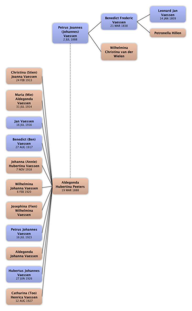 Petrus Joannes (Johannes) Vaessen Benedict Frederic Vaessen Leonard Jan Vaessen Petronella Hillen Wilhelmina Christina van der Wielen Aldegonda Hubertina Peeters Christina (Stien) Joanna Vaessen Maria (Mie) Aldegonda Vaessen Jan Vaessen Benedict (Ben) Vaessen Johanna (Annie) Hubertina Vaessen Wilhelmina Johanna Vaessen Josephina (Fien) Wilhelmina Vaessen Petrus Johannes Vaessen Aldegonda Johanna Vaessen Hubertus Johannes Vaessen Catharina (Too) Henrica Vaessen